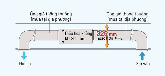Hệ thống ống gió cho phép bố trí hiệu quả nhất các miệng gió, phù hợp với việc bố trí trong phòng. Khoang hút gió hồi chuẩn phía sau giúp việc nối ống gió đơn giản hơn.