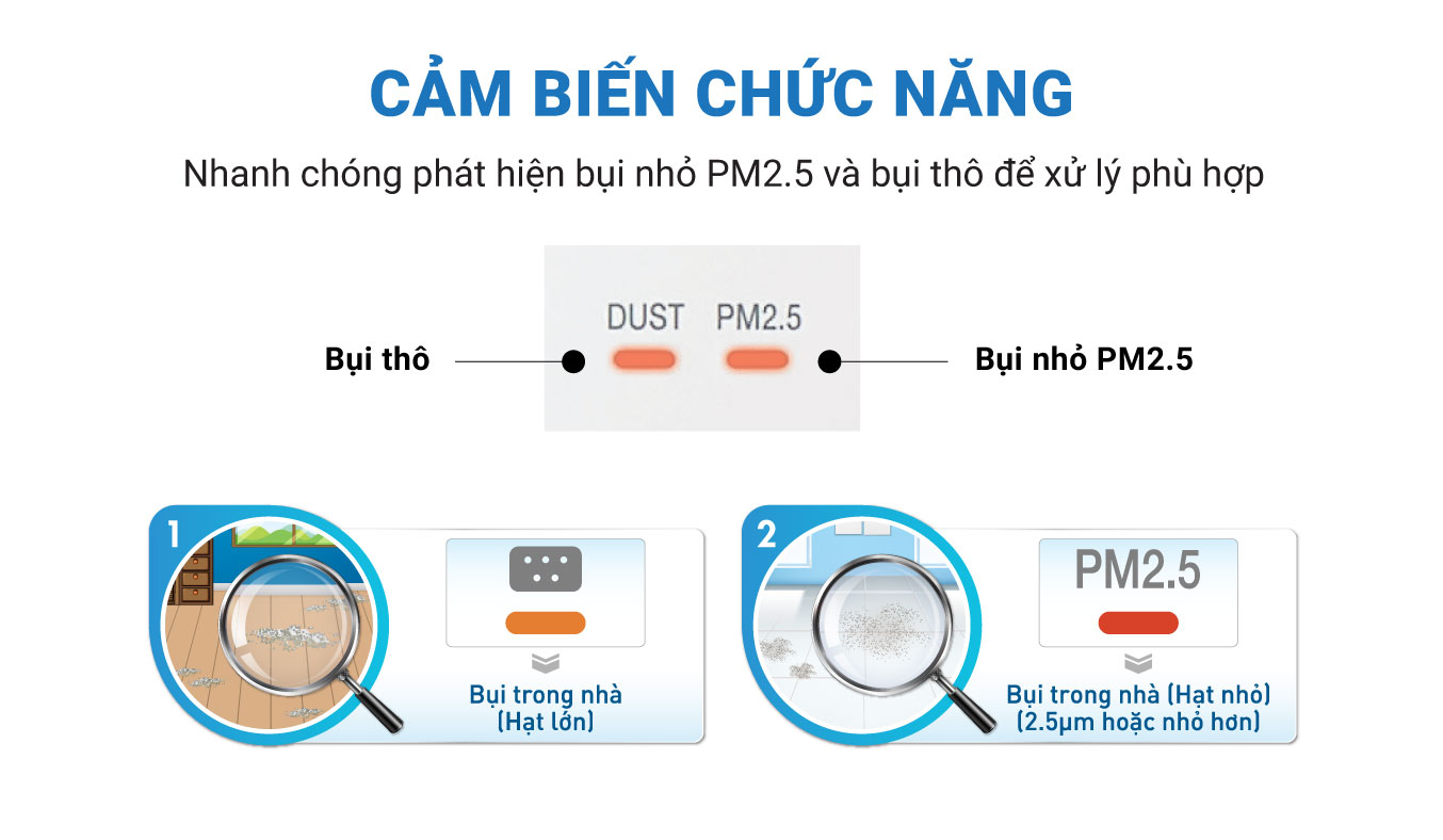 Cảm biến bụi phát hiện bụi trong nhà và những hạt PM2.5 kích thước nhỏ khoảng 2.5μm và nhỏ hơn, cùng với đèn hiển thị chất lượng không khí. -