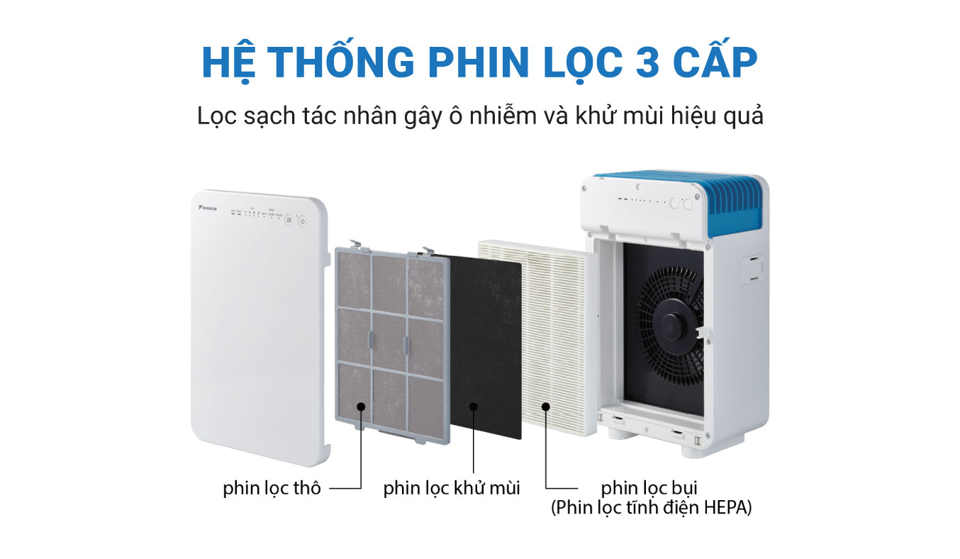 Hệ thống phin lọc 3 cấp: bộ lọc thô, lọc khử mùi và lọc bụi mịn (HEPA tĩnh điện) đảm bảo lọc không khí hiệu quả và triệt để