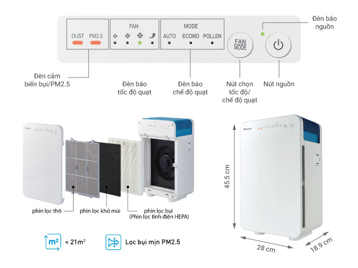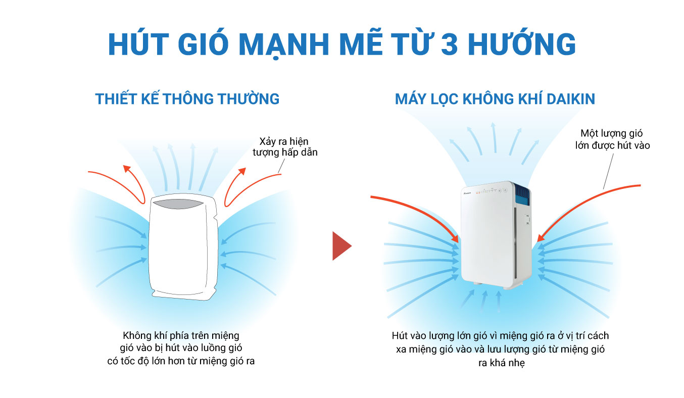 Máy lọc không khí Daikin với thiết kế 3 miệng hút gió (trước, trái , phải) cho phép hút vào một lượng lớn không khí, từ đó nhanh chóng làm sạch không khí trong phòng, gia tăng hiệu suất lọc khí. Ngoài ra với thiết kế 3 hướng hút, cho phép máy có thể đặt sát tường mà vẫn đảm bảo hiệu suất lọc khí