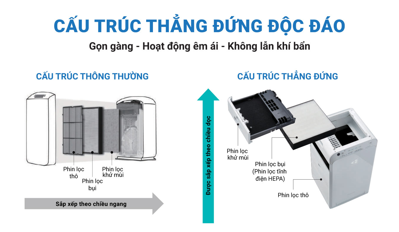 Máy lọc không khí Daikin được thiết kế theo cấu trúc dạng tháp (sắp xếp theo chiều dọc), nhờ đó mang lại nhiều ưu điểm vượt trội: