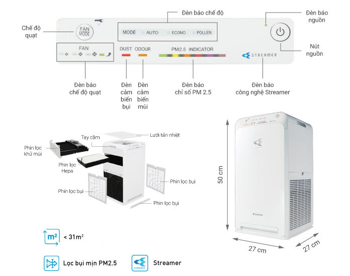 Máy lọc không khí Daikin được thiết kế theo cấu trúc dạng tháp (sắp xếp theo chiều dọc), nhờ đó mang lại nhiều ưu điểm vượt trội: