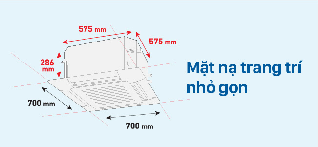 Cassette âm trần 4 hướng thổi (FFF) phân phối gió đều, thiết kế gọn cho trần 600mm, vận hành hiệu suất cao và tiết kiệm năng lượng.