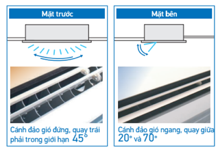 - Cánh đảo gió ngang và đứng có thể điều chỉnh bằng điều khiển từ xa, mang luồng gió 4 chiều đến mọi góc phòng.